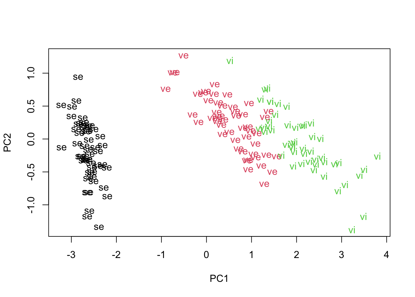 text(newiris[,1], newiris[,2], labels=substr(iris[,5],1,2), col=as.integer(iris[,5]))